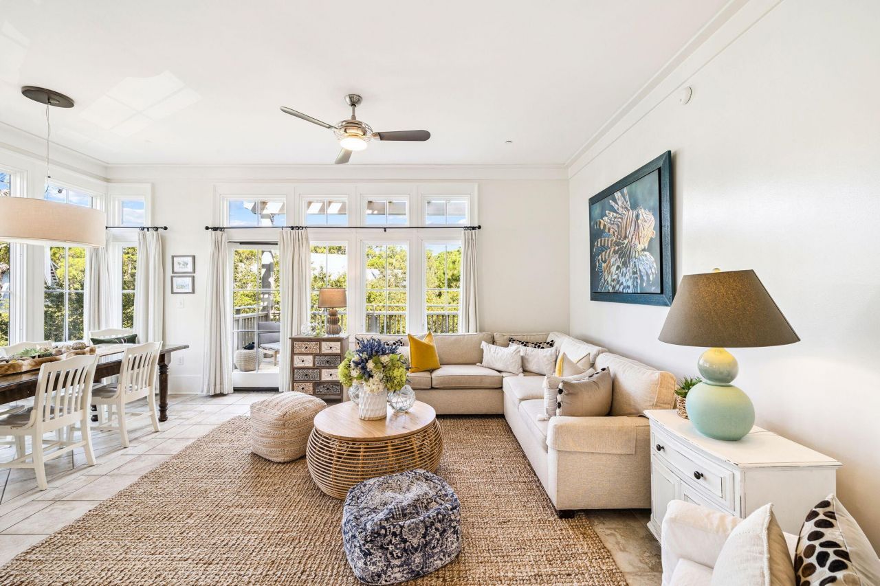 The only beachside one-bedroom, two-bath residence in Watercolor's sought-after Beach District. A rare find in the heart of 30A, this multi-level condominium spans the top two floors and offers exceptional privacy, two balconies, and sweeping treetop views, all just steps from the Beach Club, Gulf-front pools, dining, and boutique shops.The first level opens to a bright, expansive living and dining space wrapped in floor-to-ceiling windows. Natural light floods the interiors, creating a welcoming environment that blends seamlessly with the outdoors. The living area provides flexible accommodations, easily transforming into additional sleeping space for guests, while the adjoining balcony invites morning coffee or evening relaxation in the coastal air. The dining space comfortably... ...seats six, anchored by a kitchen thoughtfully outfitted with Bosch, Café, and GE appliances, blending quality, efficiency, and design for effortless entertaining.Ascending to the second floor, the primary suite becomes a retreat unto itself. Perched above the treetops, this private sanctuary features its own balcony with sweeping sunset views. the perfect vantage point to close the day with a cocktail in hand. With its elevated position and sense of seclusion, the suite captures the essence of refined coastal living.Beyond the residence, owners enjoy access to Watercolor's exceptional amenities, including six resort-style pools, a private beach club with Gulf-front dining, tennis and pickleball courts, a state-of-the-art fitness center, and a vibrant town center filled with shops and restaurants. Parking is no problem, as 2 owner's parking permits for any-time parking in the convenient Green B lot are included with purchase! Scenic biking and walking trails wind throughout the community, connecting residents to Western Lake, lush green spaces, and the natural beauty that defines Watercolor.Blending a prime location with privacy, design, and world-class amenities, this residence offers a rare opportunity to experience the best of coastal living along 30A.
