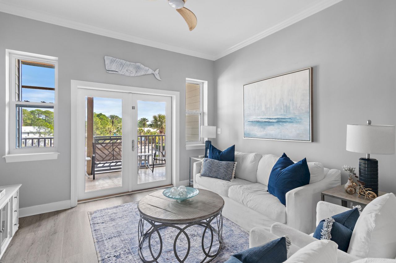 Welcome to Seagrove Highlands, a true treasure located in the heart of Seagrove Beach along Scenic Highway 30A! As you walk through the doors, prepare to be truly enchanted by the awe-inspiring soaring ceilings that elevate the open floor plan, creating an expansive sense of space and freedom that instantly makes you feel at home. The living room is flooded with sunlight pouring in through gorgeous French doors and windows, inviting you to unwind and entertain in an atmosphere that radiates warmth and friendliness. Imagine the delightful moments you'll spend on your private screened balcony, sipping your favorite beverage while soaking in the serene surroundings! You'll absolutely fall in love with the open kitchen, where sleek modern white cabinets shimmer in harmony with stainless steel appliances. The center island, complete with cozy seating for two, is the perfect spot to enjoy a leisurely morning coffee or whip up delicious snacks for family and friends!As you retreat to the luxurious primary suite, tranquility envelops you in this peaceful oasis. This stunning sanctuary boasts a lavish private bathroom equipped with a spacious walk-in shower, a double vanity, and a bathtub that invites you to soak away the stresses of the day. In addition to the primary suite, this unit also features two guest bedrooms and another bathroom. With coastal decor and LVP flooring throughout, you'll immediately sense the elegance and comfort in every corner.And that's just the beginning! This unit comes fully furnished and rental-ready, complete with an awesome 6-seater golf cart to cruise around 30A in style! But wait, there's more! Dive into the array of fantastic amenities, including a clubhouse, a charming pier overlooking the lake, a refreshing swimming pool perfect for those sunny days, and walking trails that beckon you to explore the natural beauty that surrounds you. Ideal for those seeking an active lifestyle, you'll find yourself just moments away from not one, but two public beach accesses! All information is believed to be correct; buyer to verify all information in the MLS listing.
