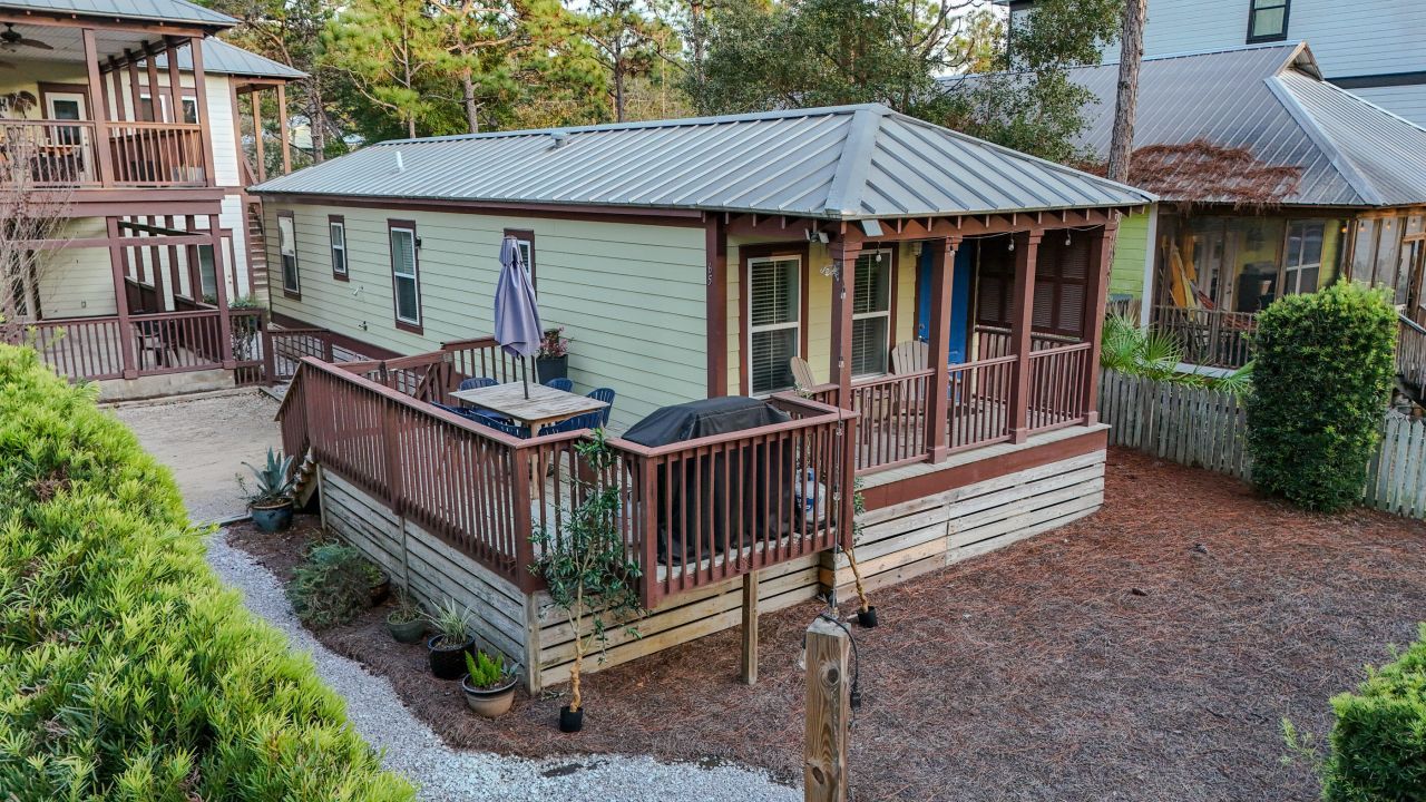 Ultimate privacy and coveted beach access on one of Gulf Shore Manor's most desirable no-HOA lots. Backing to State Forest with wooded views on three sides, this rare corner property offers natural light, quiet surroundings, and easy access to deeded beach access. The furnished guest cottage includes 1 bed/1 bath, a 2-car garage, vaulted ceilings with wood beams, full kitchen, washer/dryer, and two-story porches. Hot water heater replaced in 2022; HVAC in 2023. The porches can be enclosed, and the lot allows space for a pool. The detached main cottage offers 2 beds/1 bath, full kitchen, washer/dryer, and large porch. Hot water heater replaced in 2022; HVAC in 2024. Close to trails and minutes to Seaside, WaterColor, and NatureWalk. Turnkey, private, and full of expansion potential.