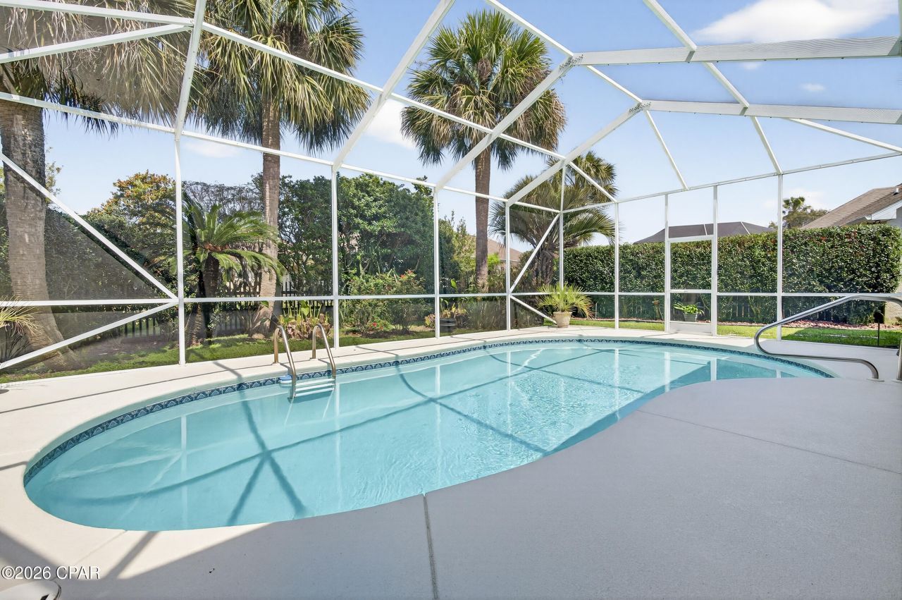 Bright, spacious, and ready for coastal living - this Palm Bay 4BR/2BA pool home offers a private backyard oasis and a location just minutes from Panama City Beach's beaches, marina, dining, and shopping. Step inside the 12-foot foyer with leaded, beveled glass doors to discover a light-filled interior with solid flooring throughout, including pickled oak hardwood and tile in the kitchen and baths. The living room features a fireplace with a custom mantel flanked by built-in bookcases. The kitchen is designed for both style and function, with abundant cabinetry and Kitchenaid stainless appliances. Major updates include a gas range connection added in 2022, along with a new stove, oven, microwave, dishwasher, and sink/faucet, plus a refrigerator replaced in 2025. The primary suite is a private retreat featuring its own fireplace, LVP floors, and a luxurious bath with a cultured marble double vanity, whirlpool tub, separate walk-in shower, and a stained glass window. Sliding glass doors lead to a covered lanai overlooking the in-ground pool with a screened enclosure. The backyard is lush and professionally landscaped, creating a serene, garden-like setting with plenty of privacy. Additional features include an extra-large 2-car garage with its own AC, a 2019 roof, and a 2022 HVAC system. Don't miss the chance to experience this exceptional home - schedule your private showing to see everything it has to offer.